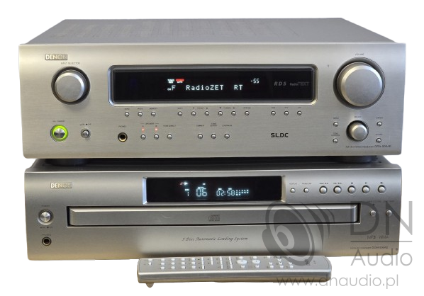 Denon DRA-500AE, DCM-500AE – zestaw amplituner stereo + zmieniarka CD na 5 płyt + pilot.